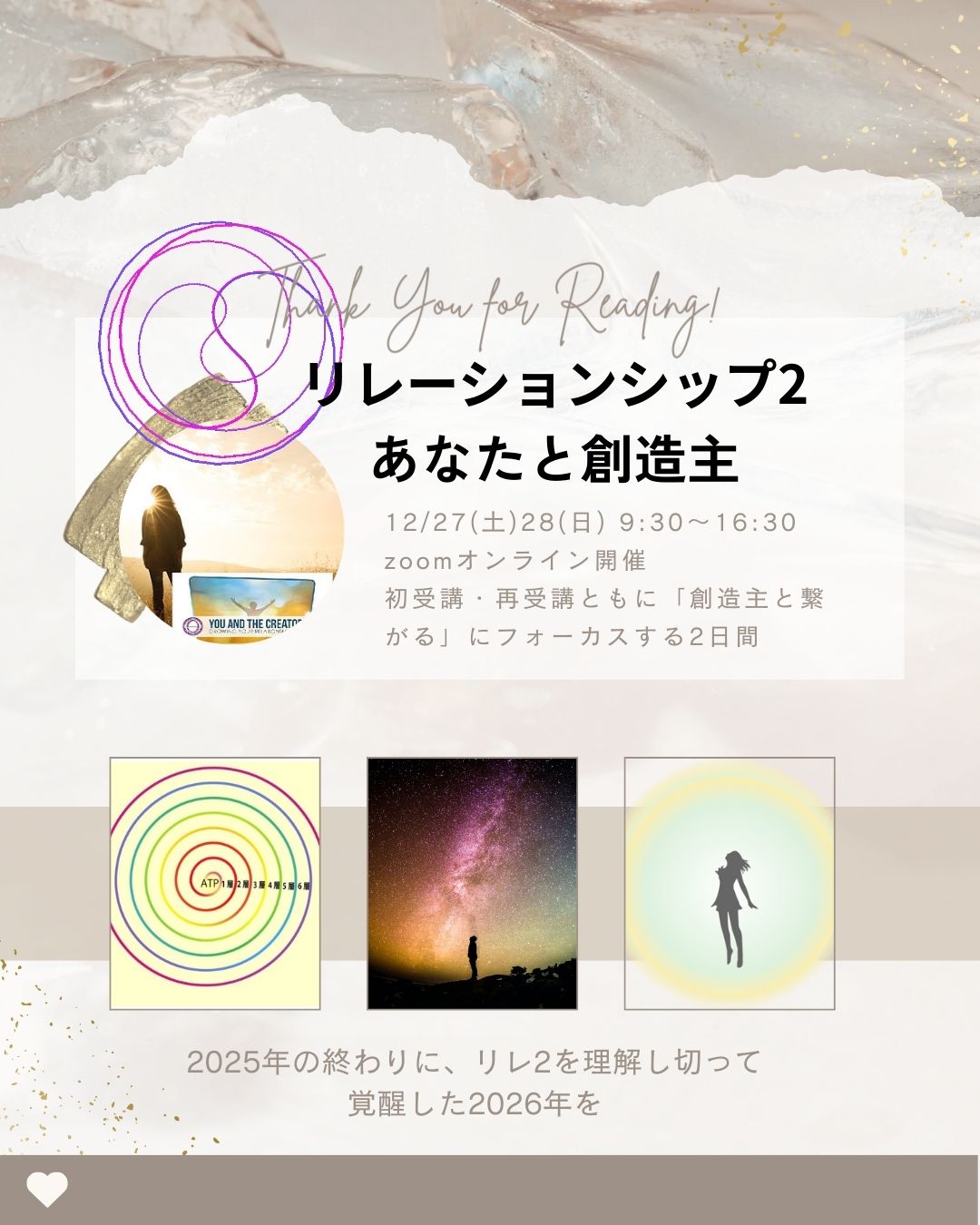 というわけで、2025年最後のセミナーはリレーションシップ2 あなたと創造主です。先生に憤っていたり、欲しいものを与えてくれないとか、分かりづらかったとか、そういう感情も含めてすべては自分が「そう見たかった」という視点でとらえてみて、執着や後悔、怒りを手放し「真実」を見て2026年に新しい自分を愛しましょう。この世界は、あなたが望んだようにしか現実化しません。望んでなんかいないよ!と思っていても、無意識領域で底流が望んでいるのです。というわけで、以下開催要項です。