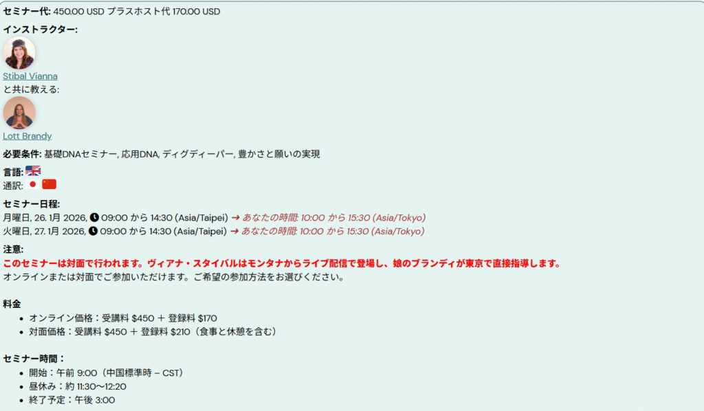 2026年1月に、ヴァイアナの娘ブランディが来日し、豊かさのインストラクタークラスと豊かさ2のプラクティショナークラスを開催します。
